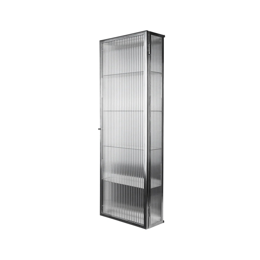 Four metal shelves included. It can be hung both ways, so the door can open in either of both ways. Bracket and screws for wall mounting included. Registered design