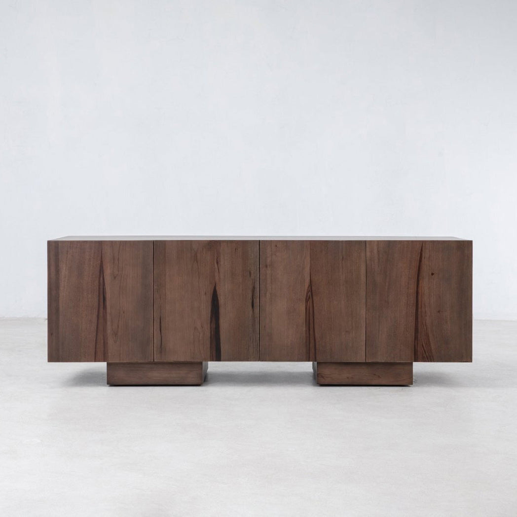 • A wire management system allows cables to flow between shelves and to the outside of the sideboard. A leather clasp gathers wires cleanly together