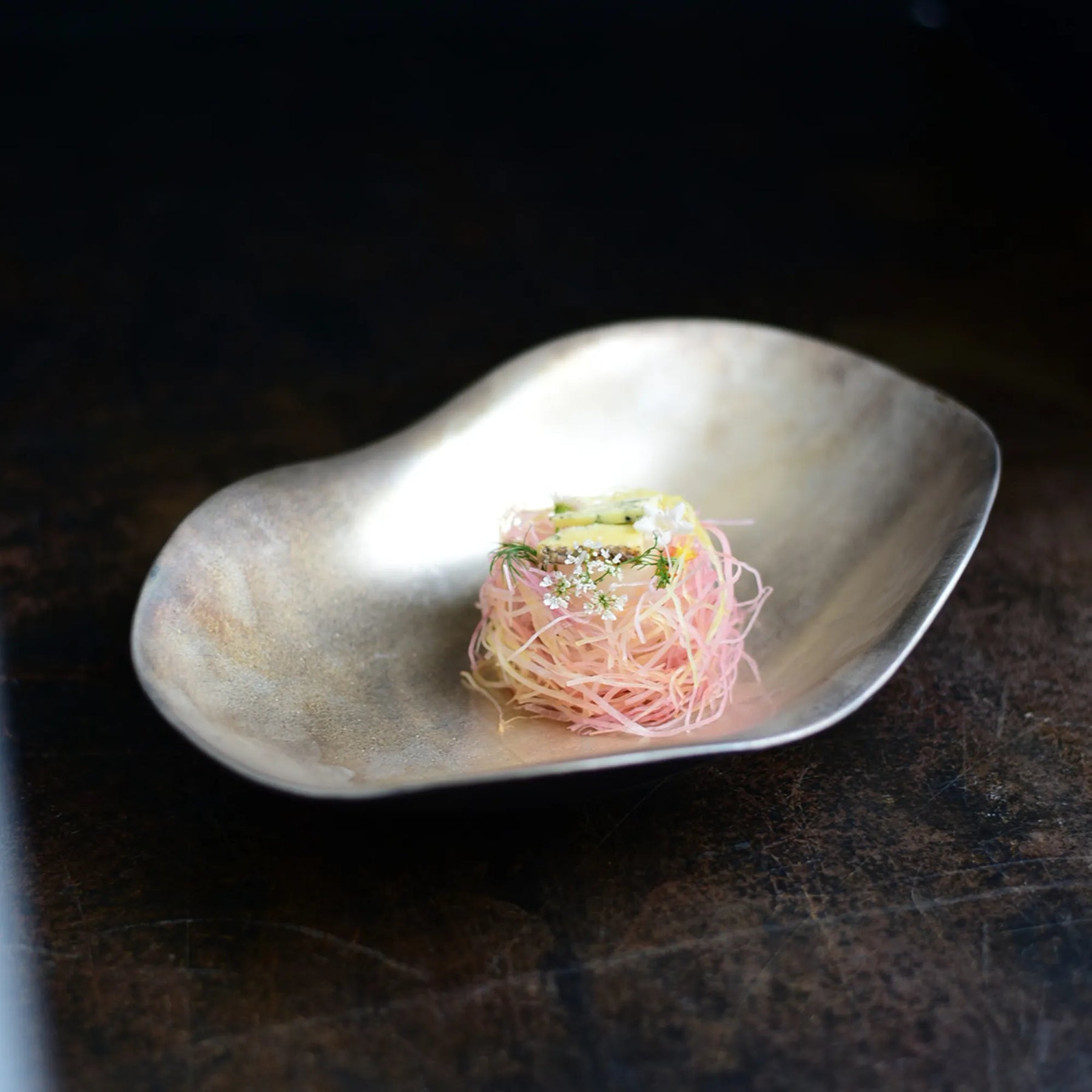 The eye-catching "Allegro" plate features its unique shape and variations of impression seen at different angles. You can easily arrange food in the center, which creates some height. As a result, the food will look nicer and more elegant. Why don't you arrange simmered food or gastro bar food to go with your drink, such as wine or sake? It can be used to serve side dishes, simmered food, bar finger food, and cut fruit.
