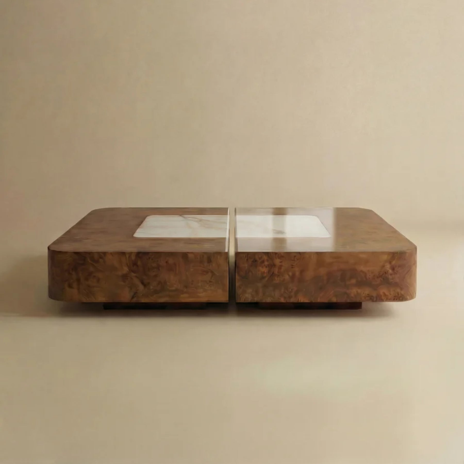 Baci Burl Wood and Shell Onyx Coffee Table with casters
