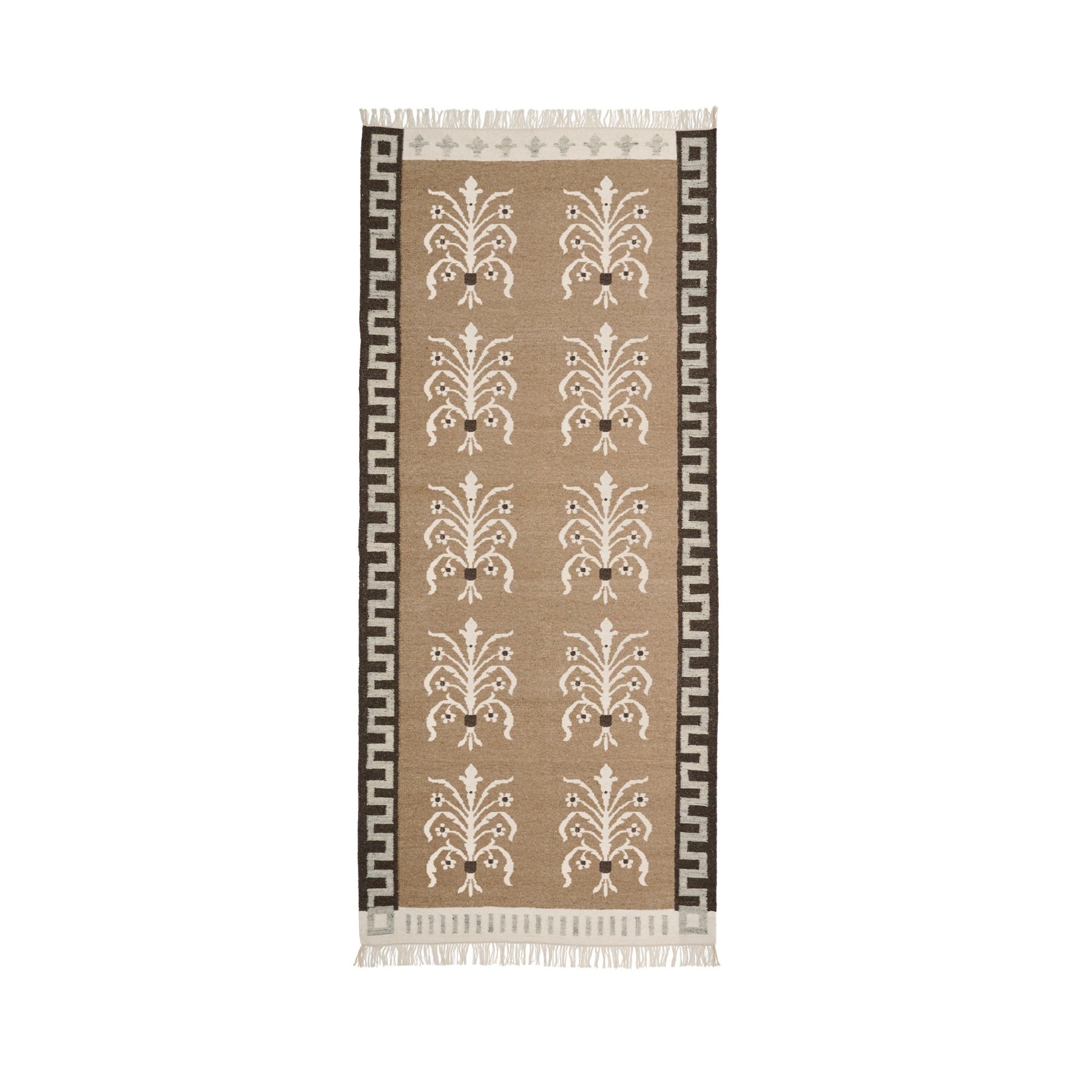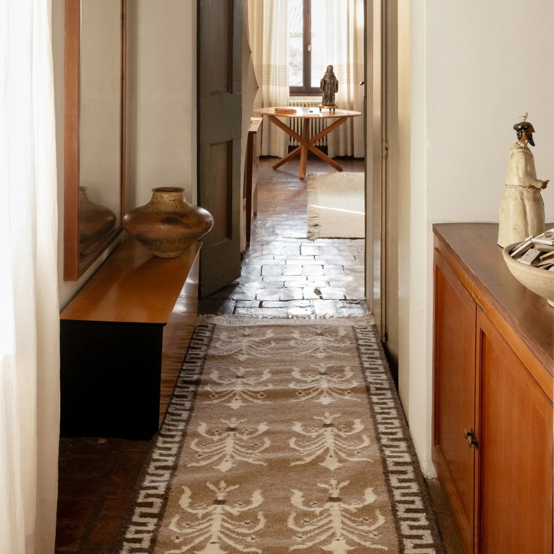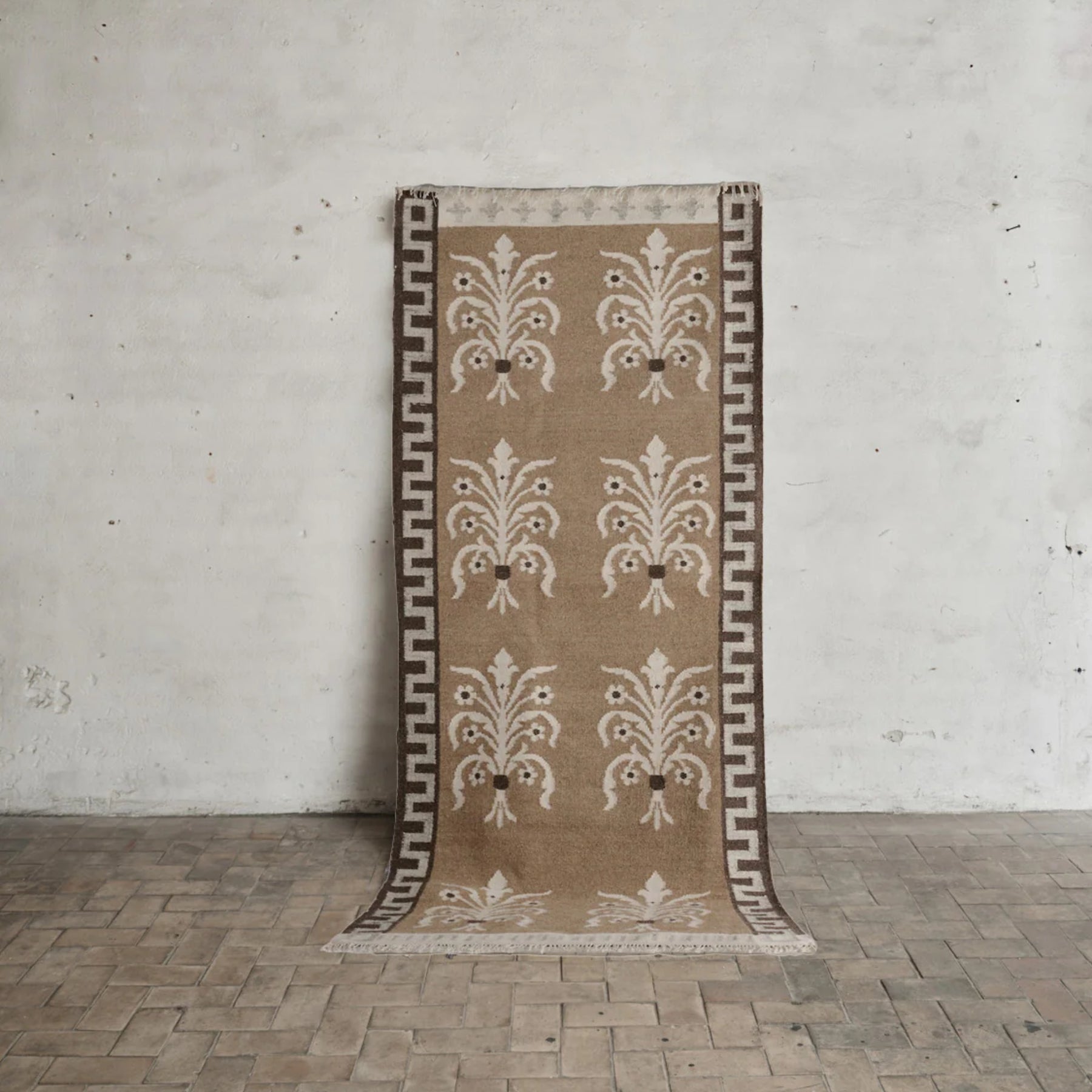 Colonnade no.10 is a hand-woven rug in a soft, sand-brown shade, highlighted by lighter elements in the pattern, evoking a serene yet sophisticated aesthetic. The floral motifs draw influence from decorative wall designs found on traditional buildings in Copenhagen’s historic Frederiksberg district.