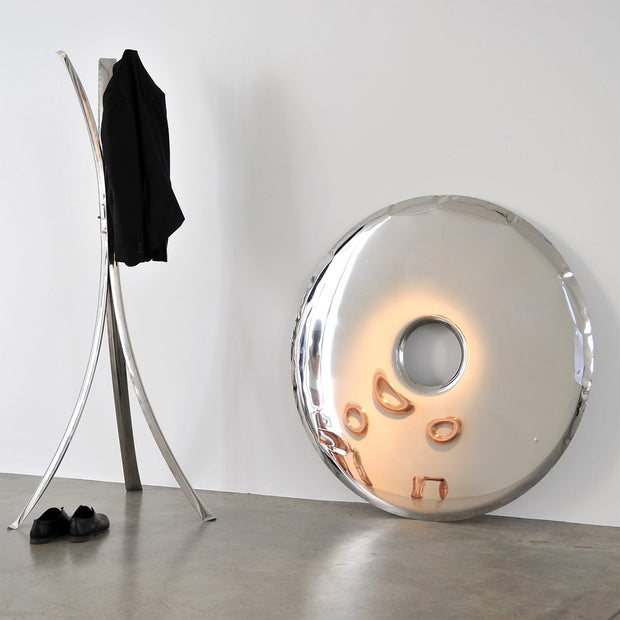 The Rondo Mirror is made of stainless steel polished to a high gloss. Its polished surface is perfectly reflecting the light and other objects placed in the same room or hall. Largescale convexities that appear on the surface of the mirror are literally able to alter the space. It is like making an individualized interior design of the moment when by rolling the mirror from one place to another everybody can create or rediscover a well-known environment to a brand new and grasping concept. Depending on Rondo´s arrangement, either by hanging it or leaning at the wall, the mirror can change the perception of the surroundings. Stainless steel