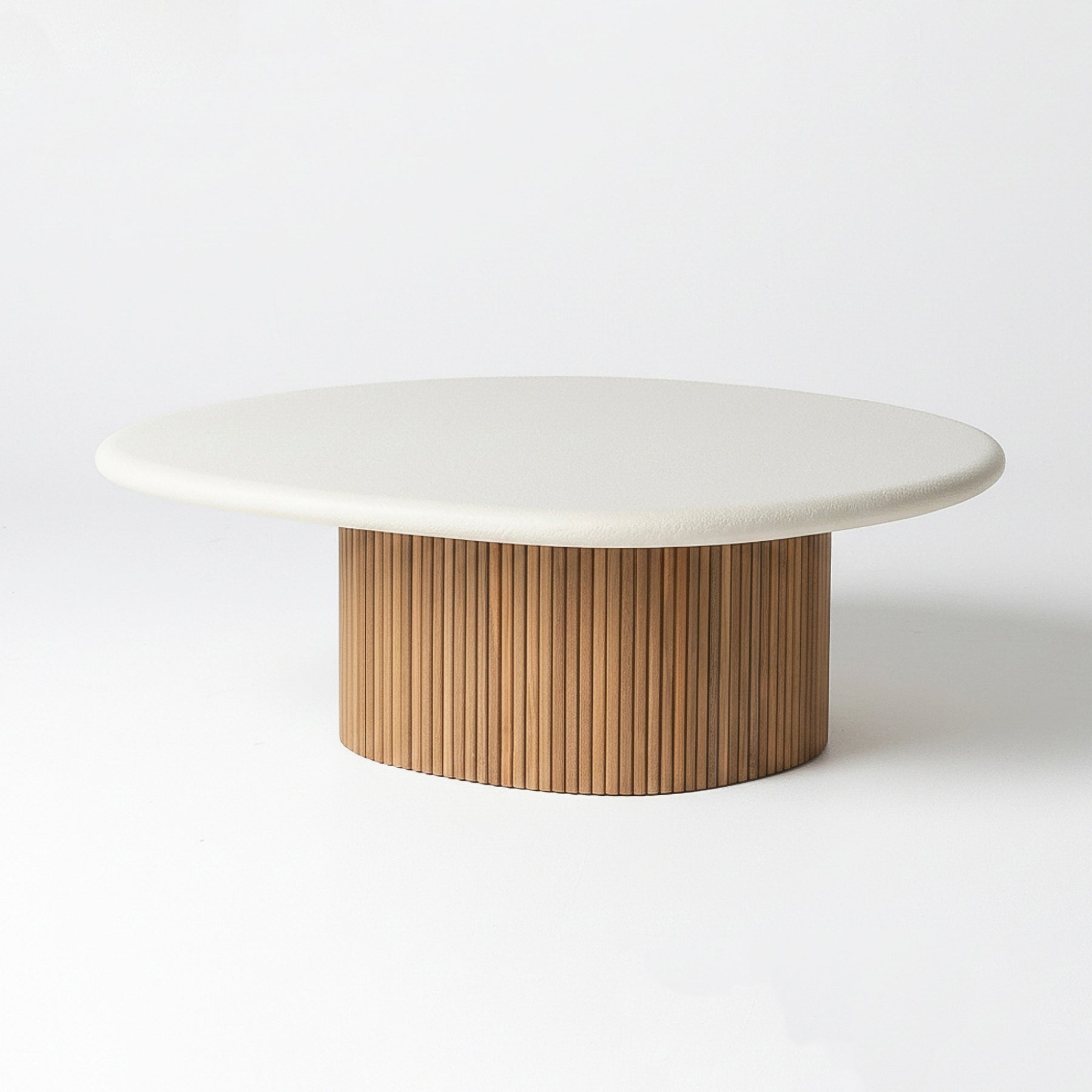 The Covira Coffee Table with Reclaimed Teak features a bold, sculptural design that anchors any living space with understated elegance. Featuring a top in a high quality microcement finish and a base in reclaimed teak, it offers both durability and a refined, modern look. The round tabletop rests on a wide cylindrical base, creating a seamless balance of form and function. Its low profile and smooth curves make it a versatile piece, perfect for both indoor and outdoor settings. Strong yet sophisticated, this coffee table is an ideal centrepiece for relaxed gatherings and stylish interiors.