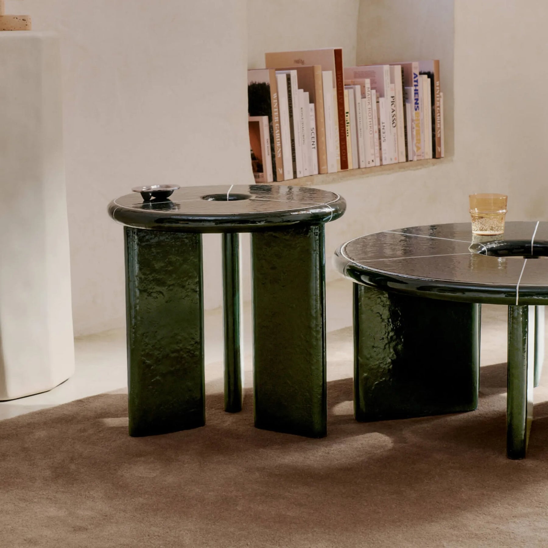 The Ferm Living x Utzon – Can Lis collaboration draws inspiration from architect Jørn Utzon’s family home in Mallorca, merging the natural environment with design elements that reflect his unique philosophy. Crafted from fibre concrete, the Deya Side Table features a striking dark green glaze with an uneven texture, accentuated by off-white grout lines. The segmented tabletop introduces a bold geometric appeal, complemented by generously rounded edges for a softened presence. Balancing artisanal craftsmanship with bold geometry, the Deya Side Table is a versatile piece, suitable for both indoor and outdoor spaces.