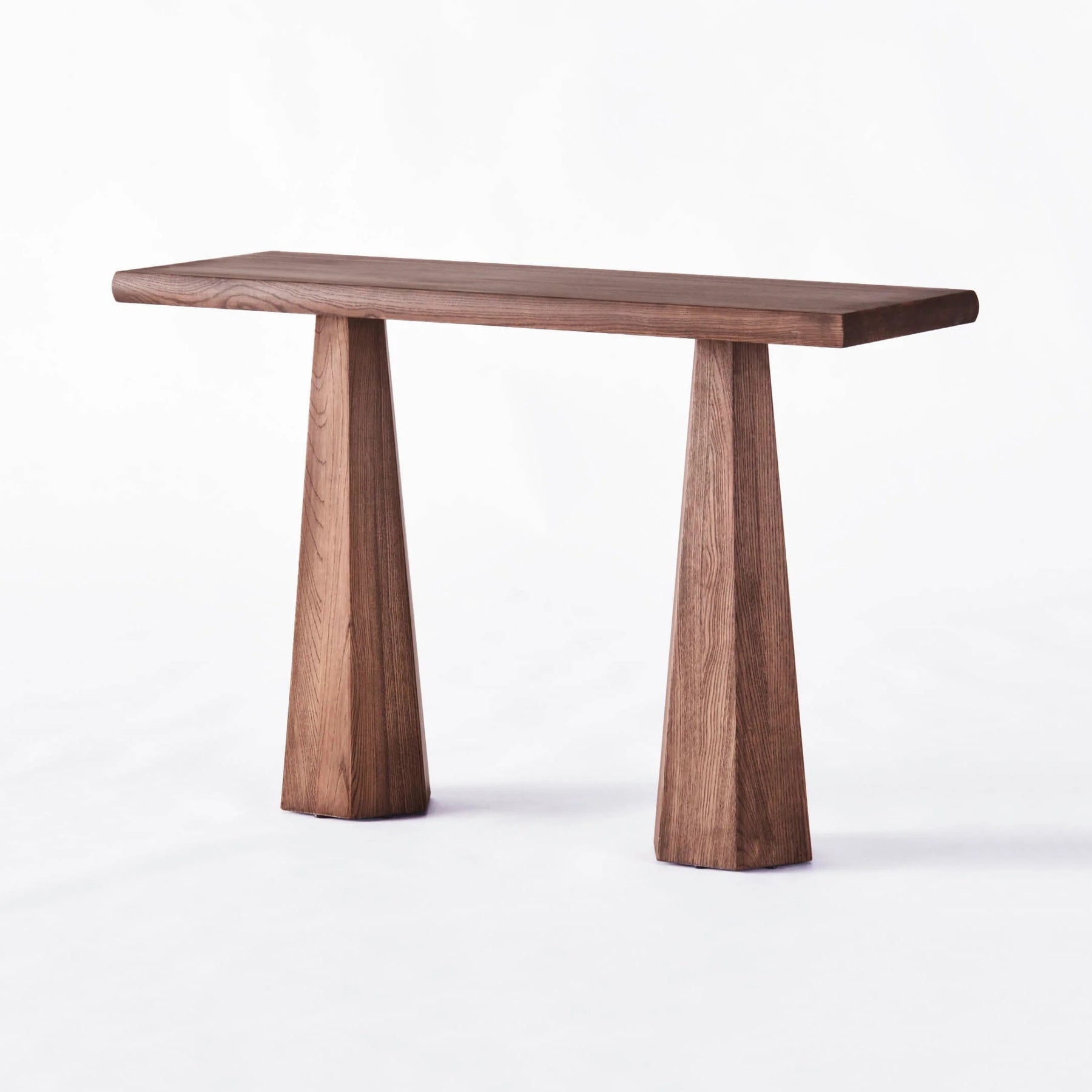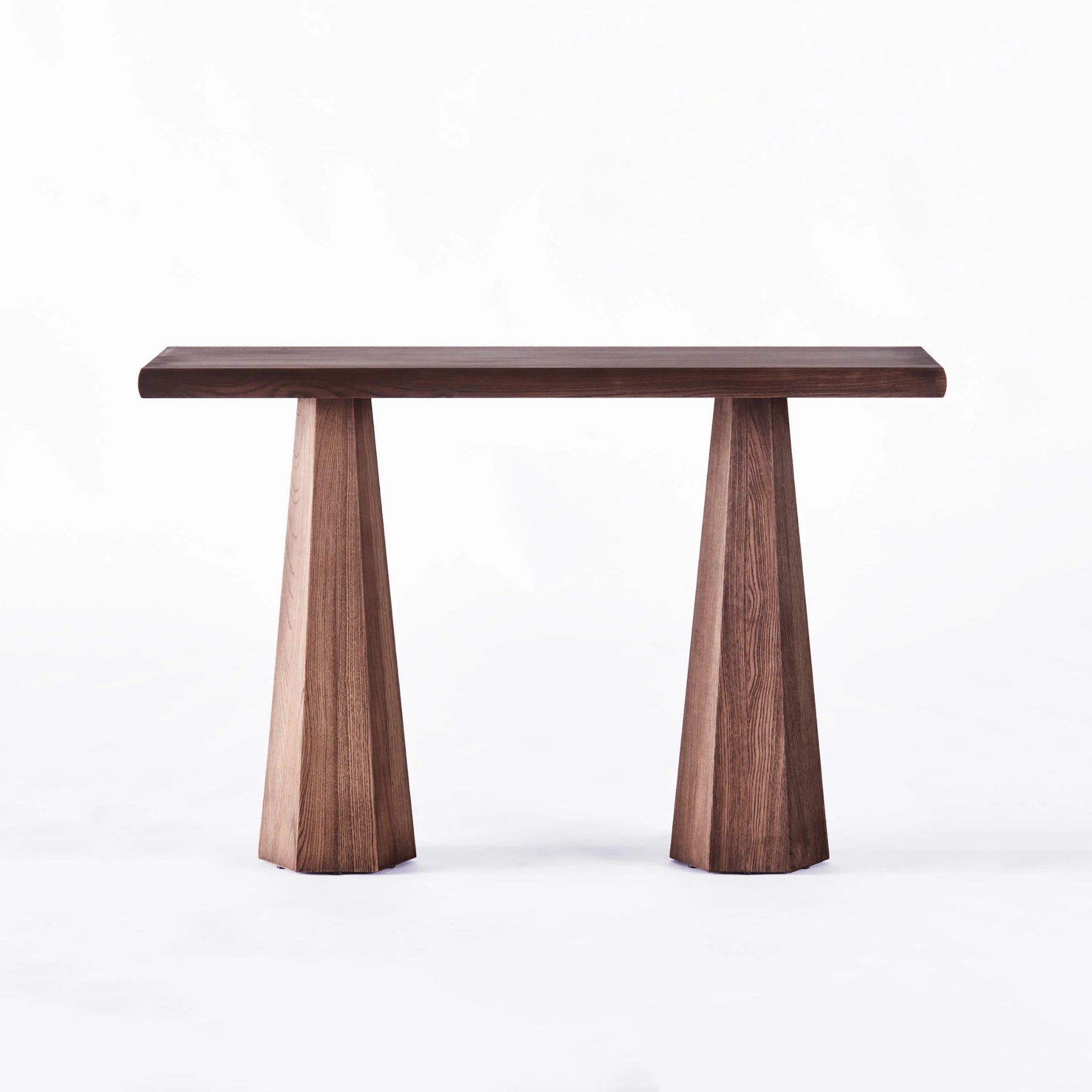 Hexagon Console Table Stained Ash is a modern console table made of solid stained ash. A rectangular tabletop sits on the two bases with a hexagonal shape.