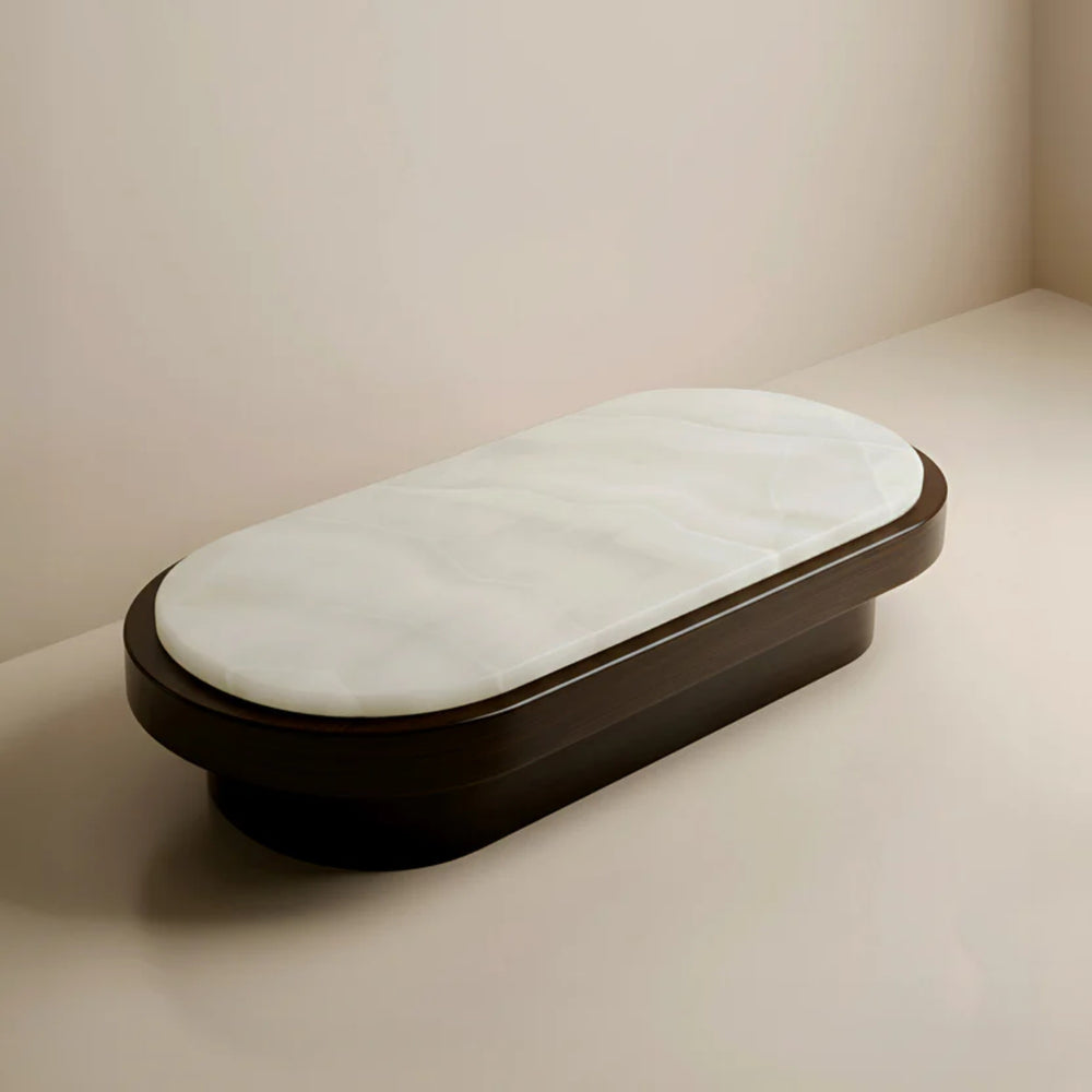 The Joan coffee table is defined by two organic shaped tops with a mix of travertine and white onyx. The round bases are made of travertine.