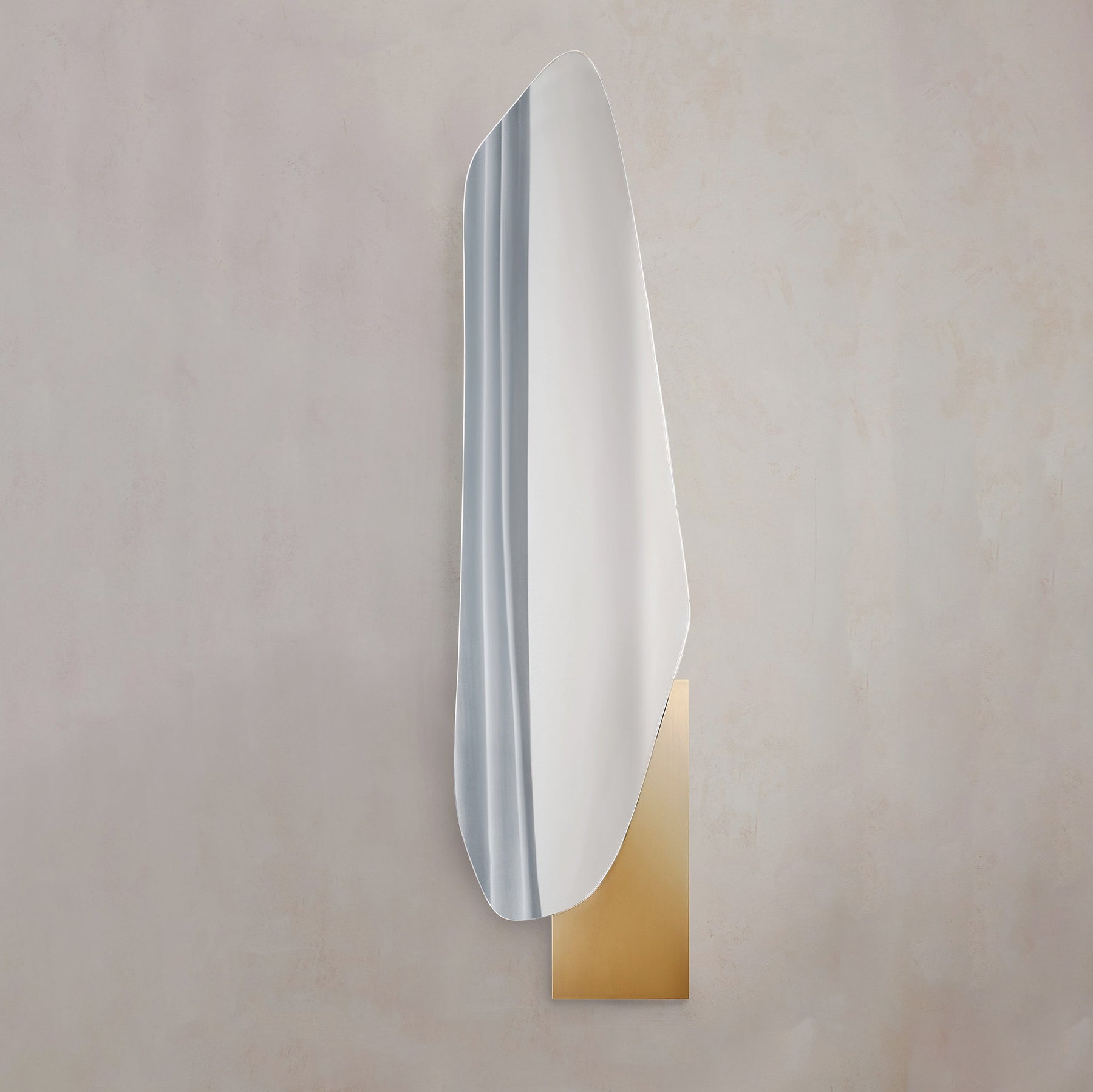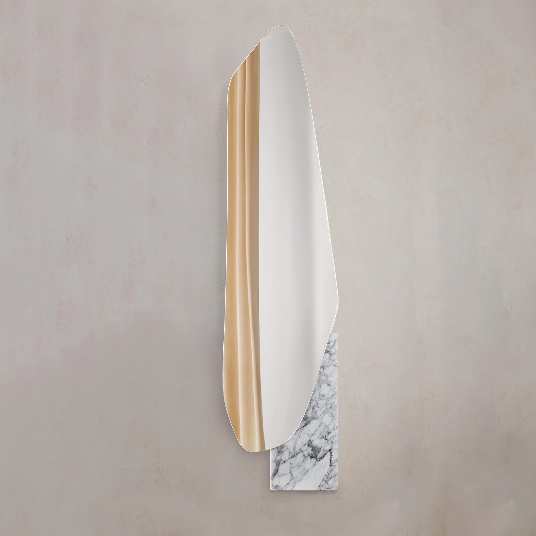 "Lakes" is a nature-inspired collection of sculptural mirrors designed by French designers Maryna Dague and Nathan Baraness. The collection takes its name from the shorelines of lakes and aerial views of their sinuous shapes, represented in the design. The designers have emphasized the contrast between the fluid shapes of the glass and the straight lines of the mirrors' supports, made of slabs of wood, brass, oxidized copper, marble, onyx, and other attractive materials. The collection features five designs, including a floor mirror