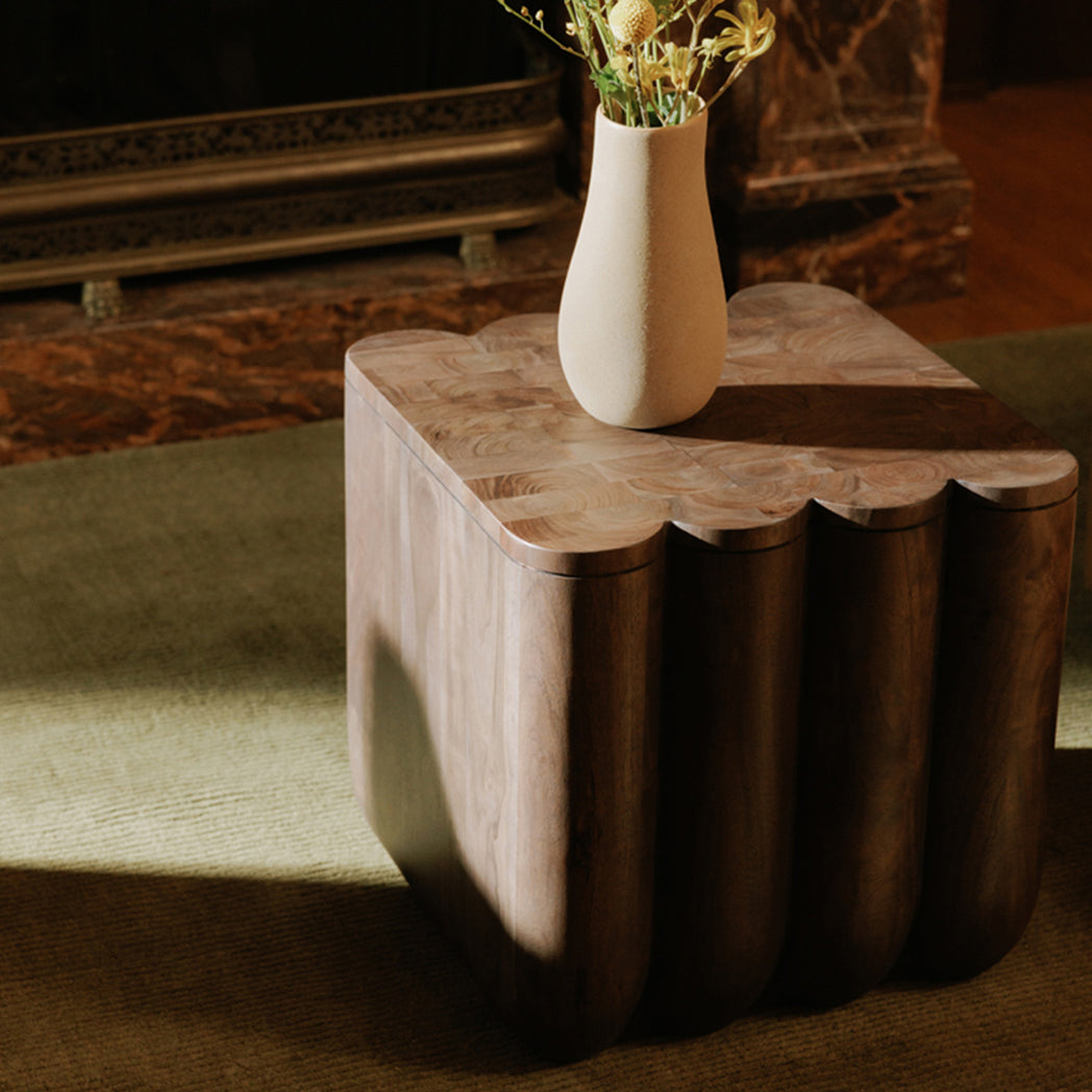 This is a playful interpretation of rhythm and repetition—a waved silhouette made of Acacia wood brings all that organic energy that calms and rebalances the senses. While this accent table's expressive profile adds both visual and tactile appeal to any interior setting, this design also utilizes end-grain pieces which come together into a beautifully patterned tabletop. Completing this distinctive piece is a unique seam that runs along with the tabletop joinery technique, visible throughout the piece's side profile.