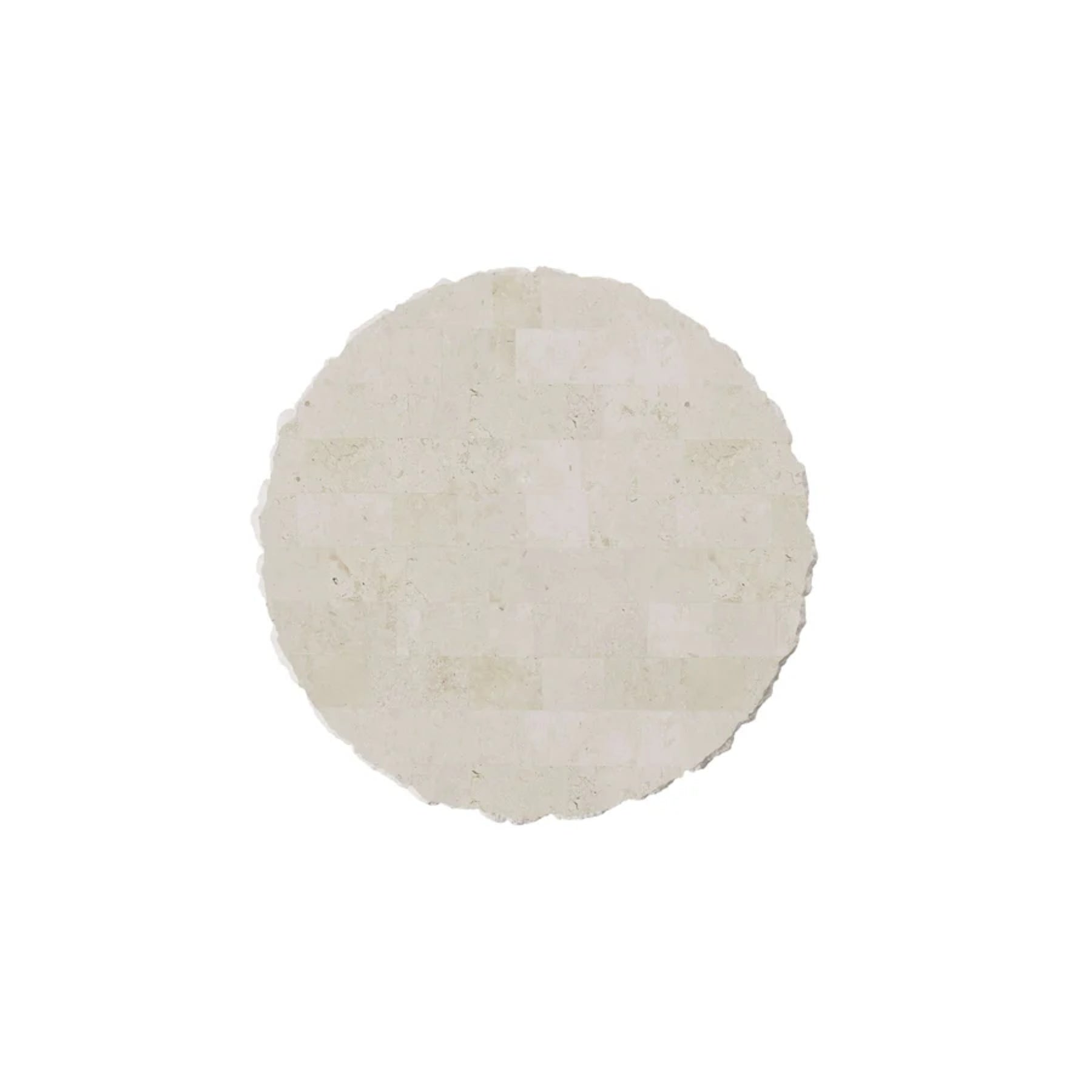 Handcrafted in our signature Fossil stone tile inlay. Each piece is a unique embodiment of natural texture with a warm maze of cream and biscotti characteristics, fossilized etchings and veining throughout. Balanced with the uniquely En Gold rough stone tile edging.
