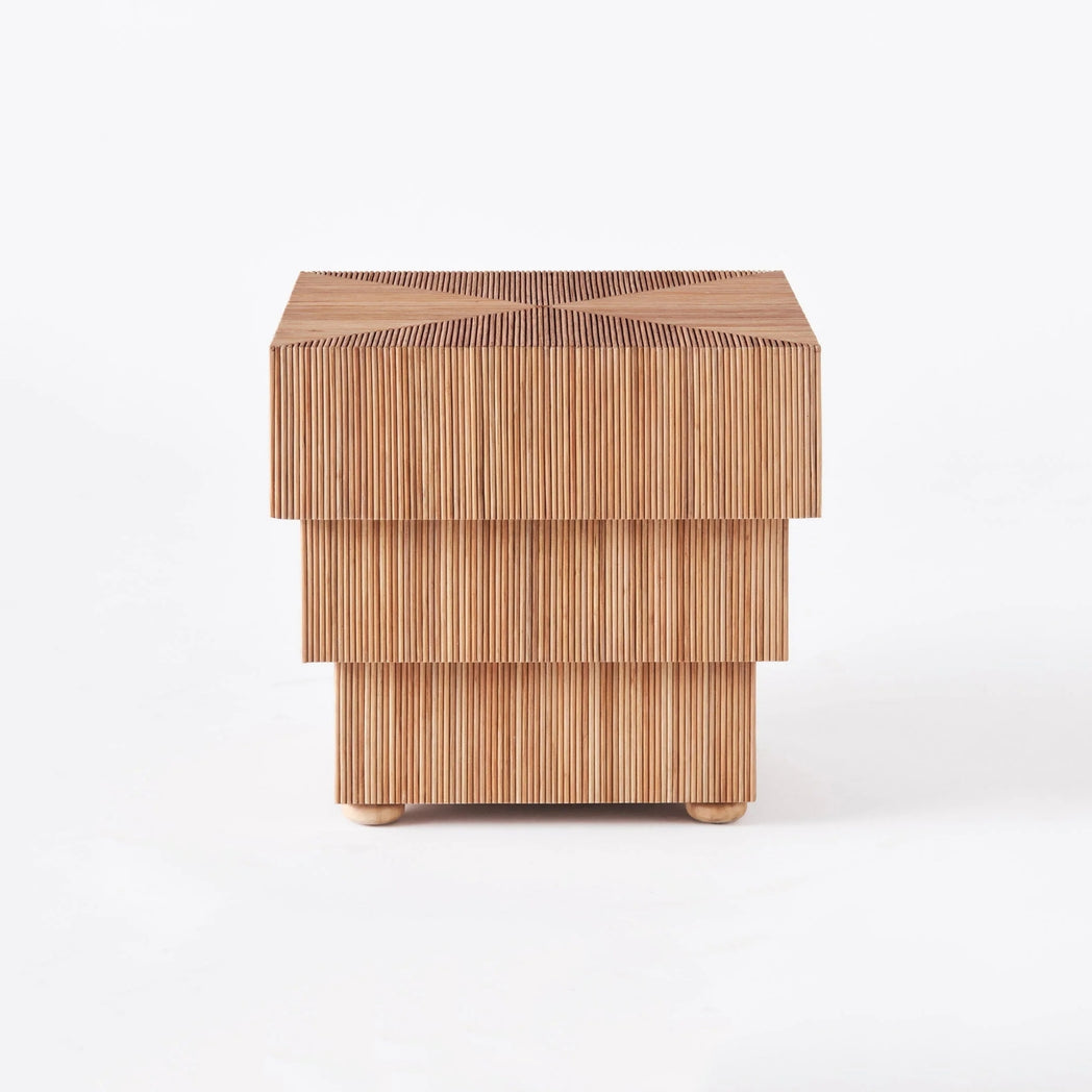 Mikado Side Table is a contemporary side table with a vintage essence. The unique design of a layered, cubic structure crafted from natural rattan, where each layer alternates slightly in size, adds a touch of modern vintage to any room. The top of the table showcases an eye-catching geometric pattern, enhancing a dynamic visual accent. A perfect fit for cozy corners or as a chic bedside table.