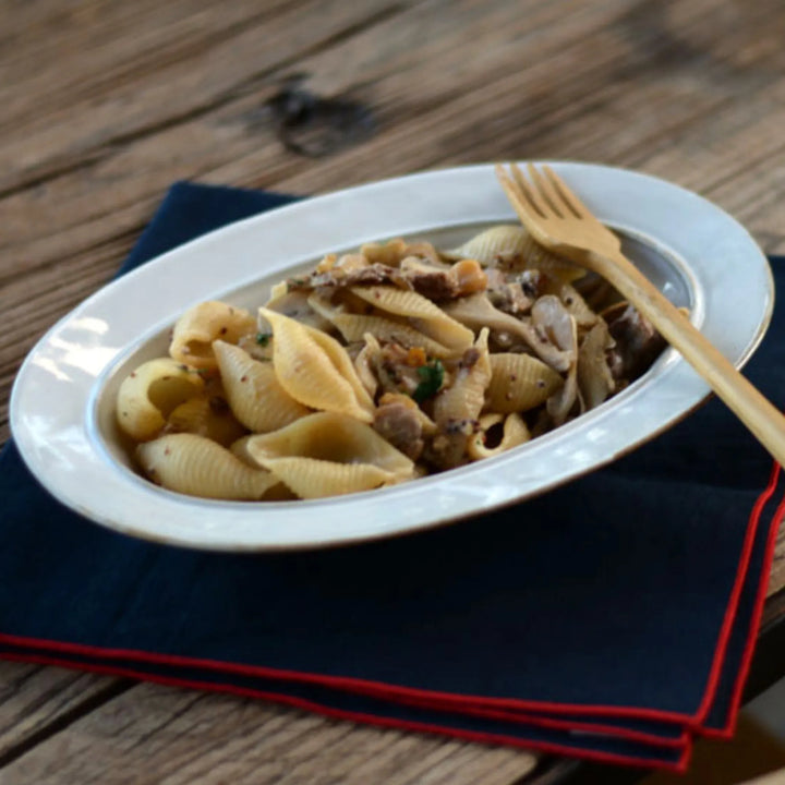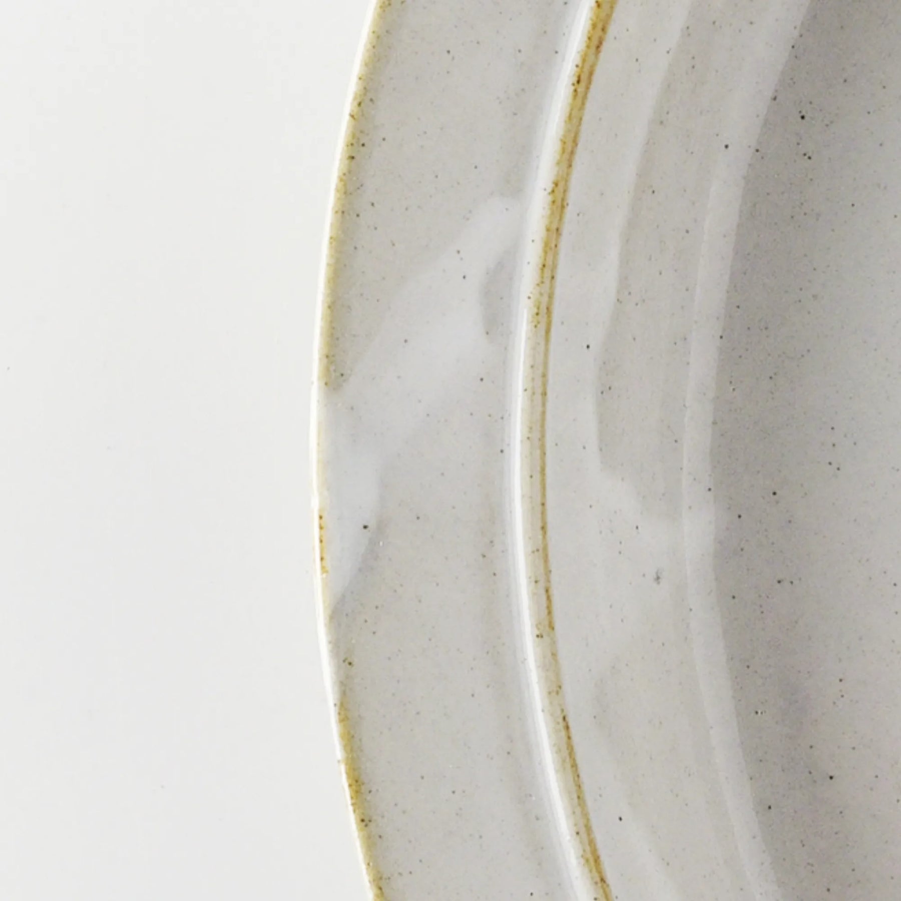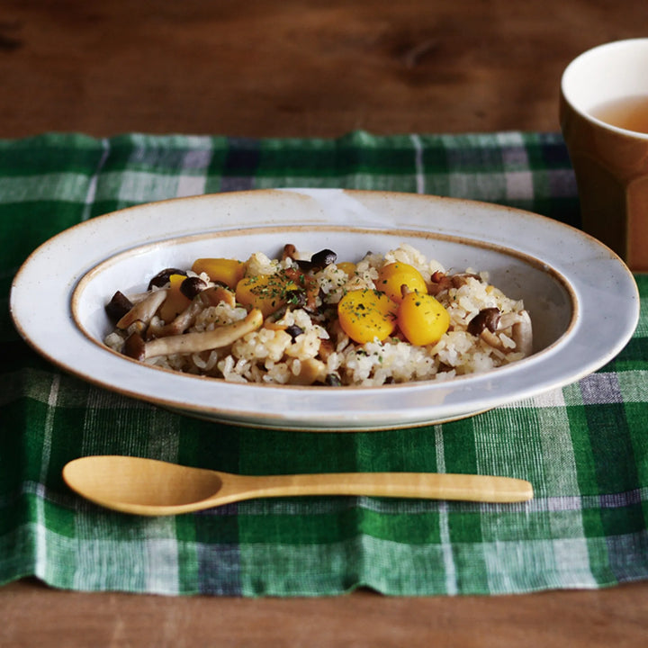 This oval bowl features subtle charms created by the red earth and white clay powdered for make-ups. The form is very suitable for serving curry, creamy stew and a western-style one-bowl meal such as Loco Moco. It is also nice for gift giving in that it has a simple design.