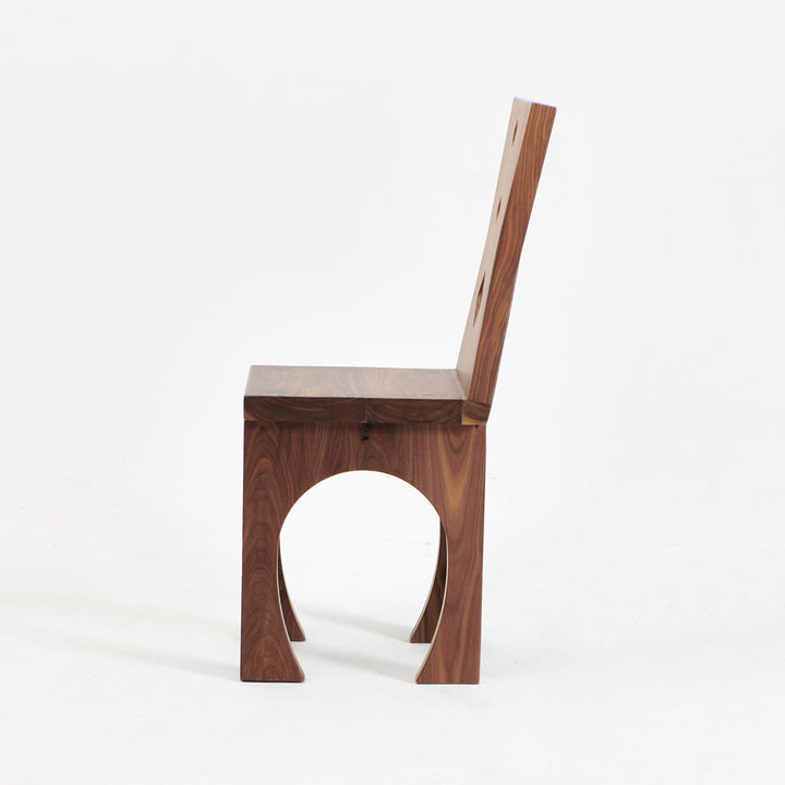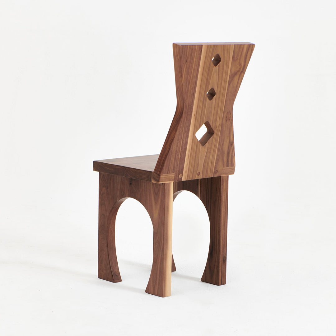 This chair is part of a series with eight different designs with a graphic shaped back rest and structural legs. Hand carved in solid walnut by skilled artisans in Northern Portugal.