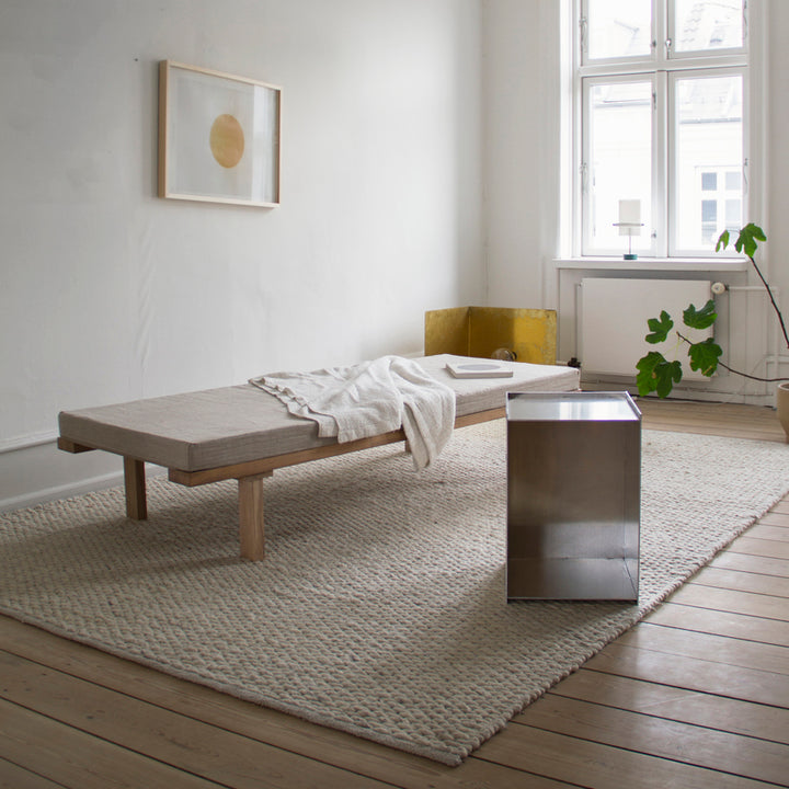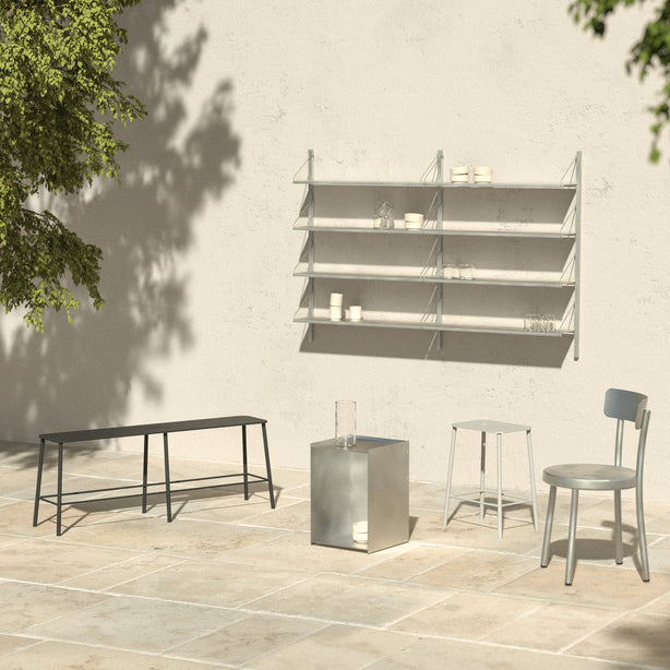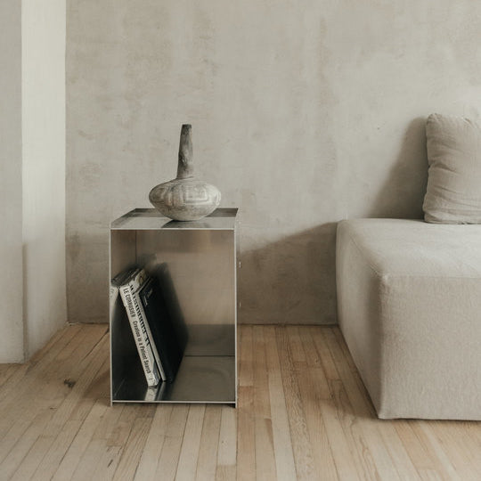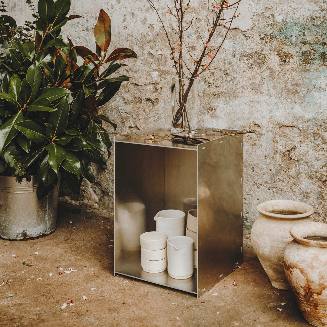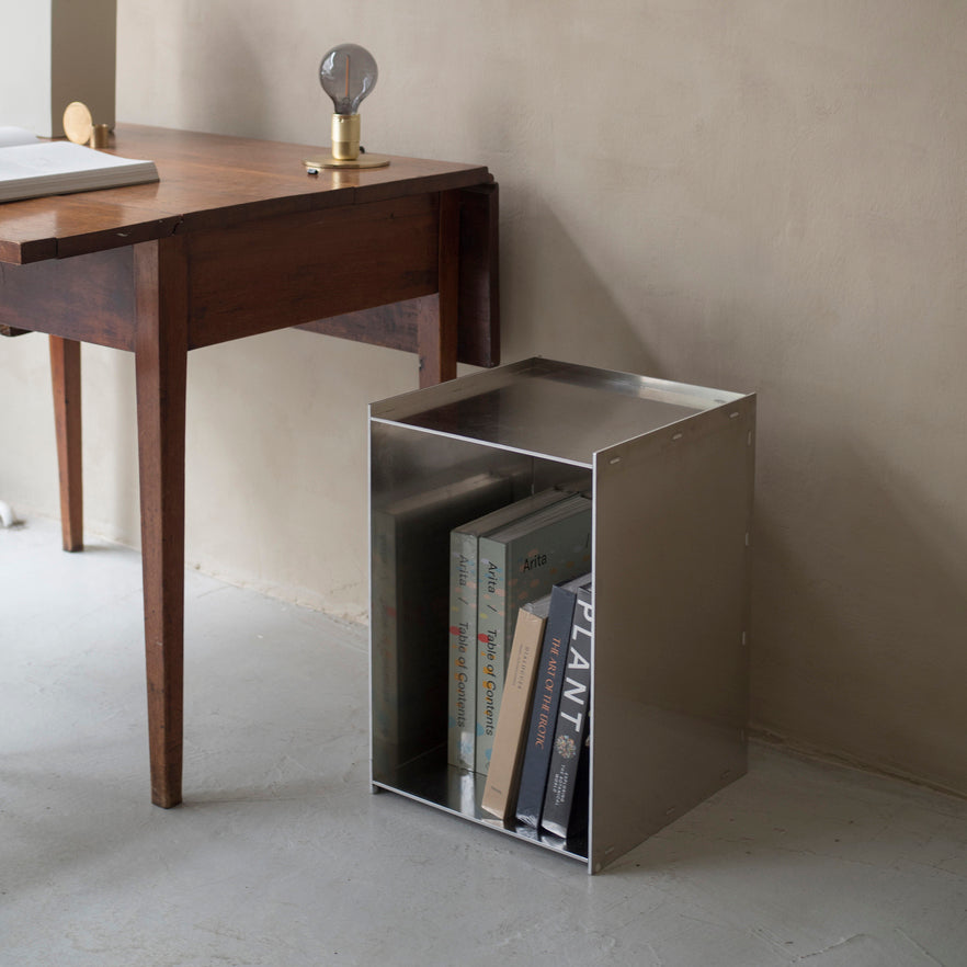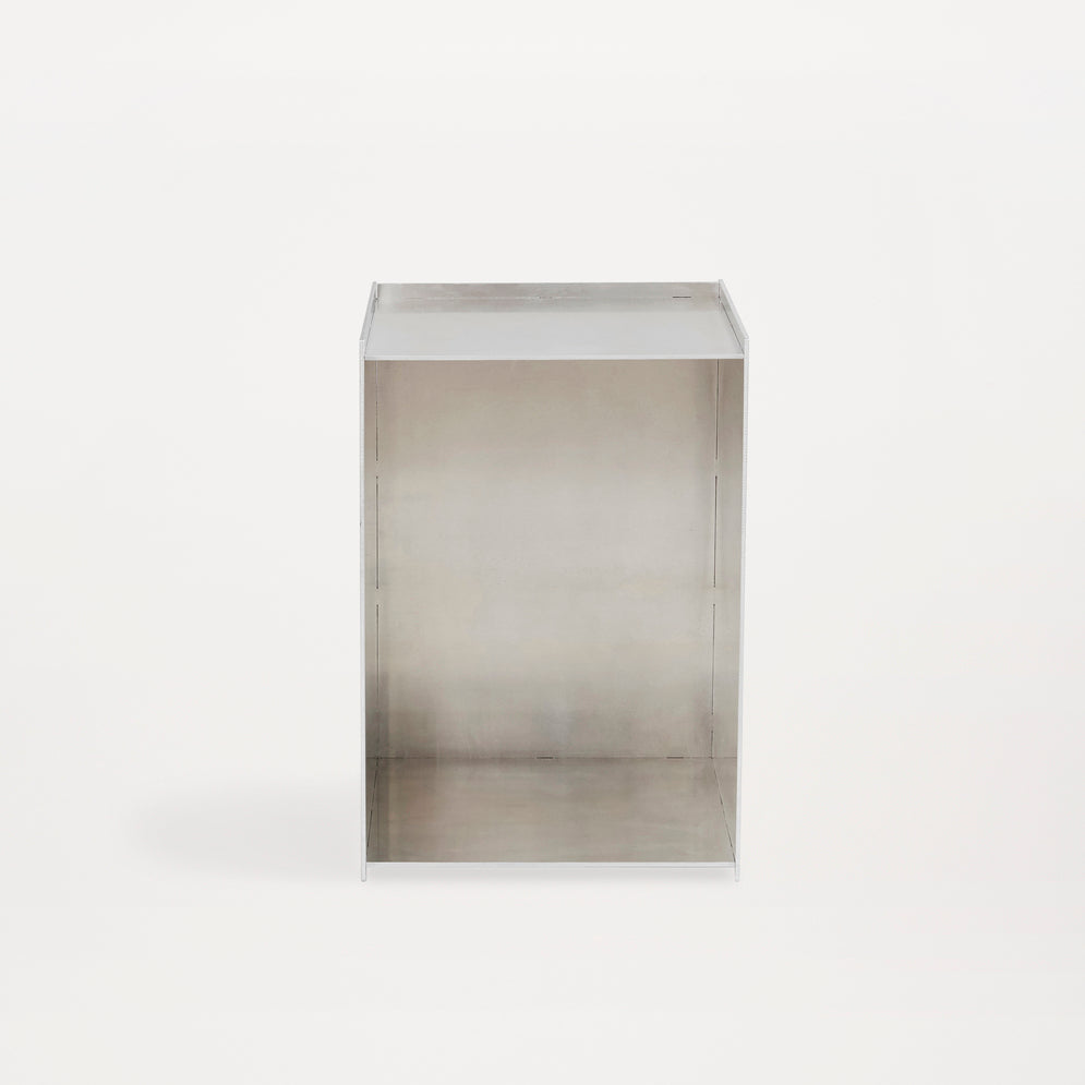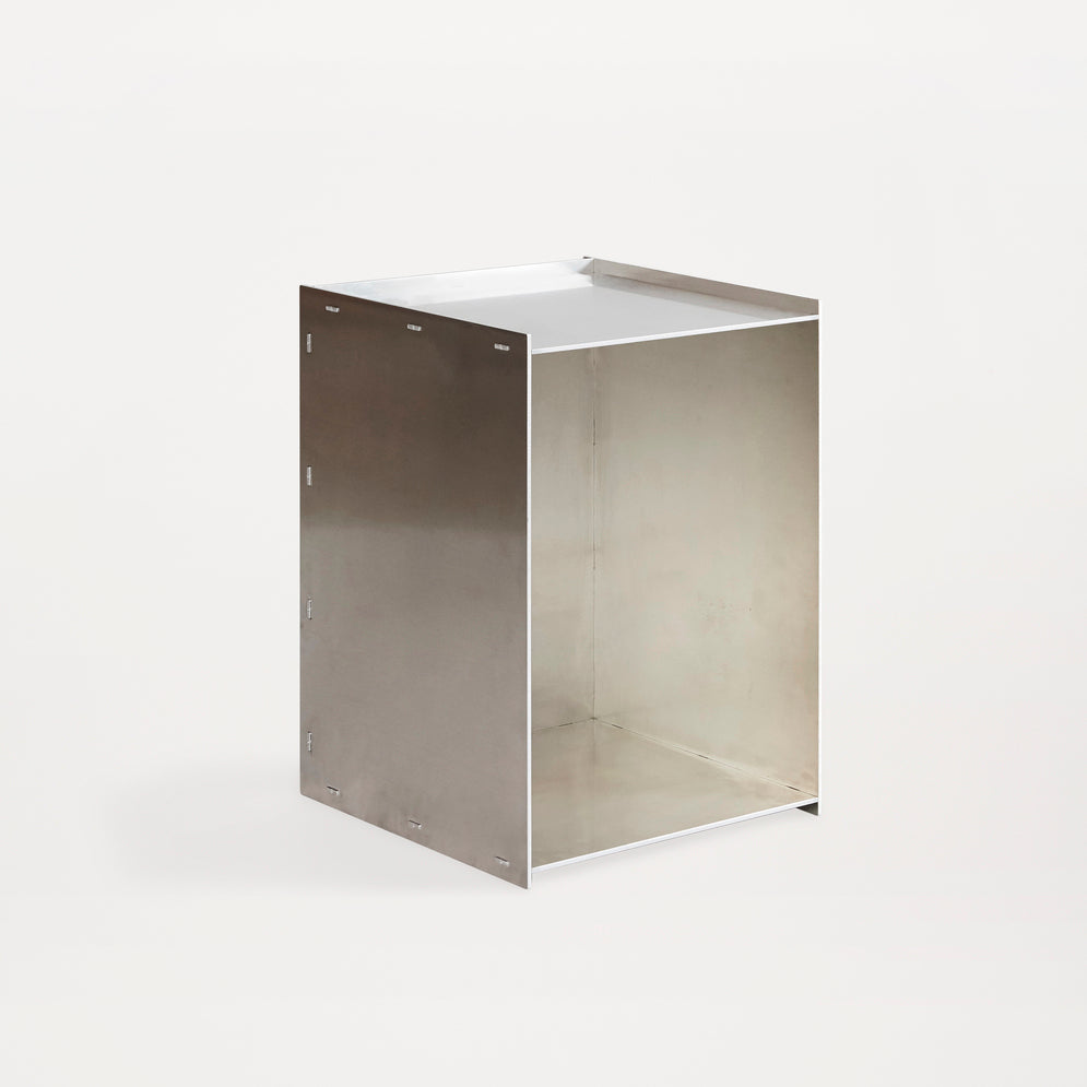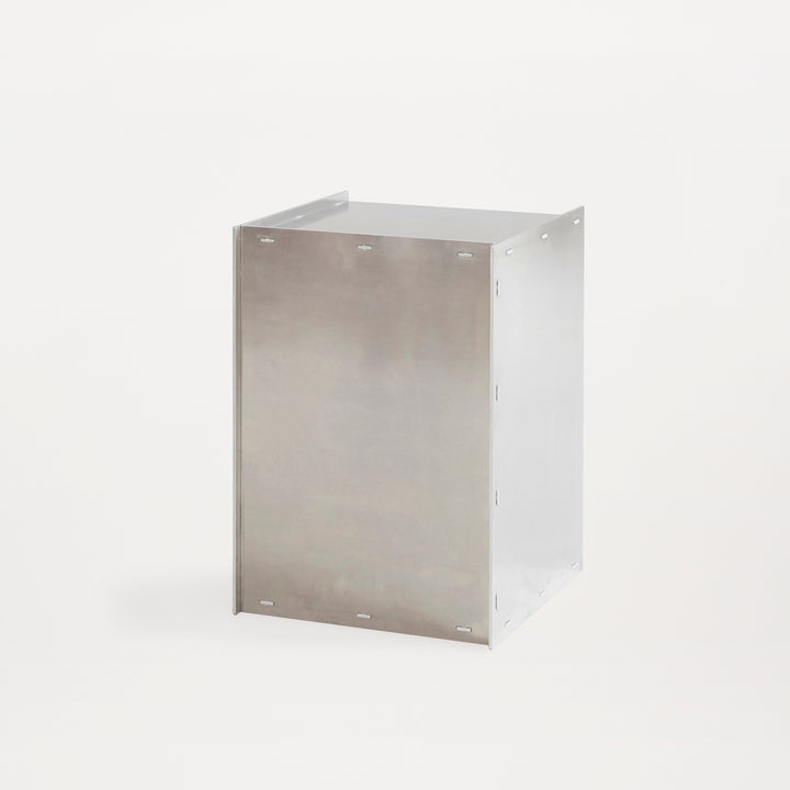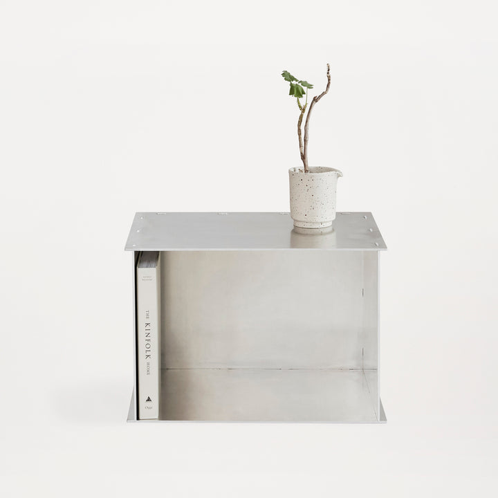 The Rivet Box Table is a sturdy, timeless piece of furniture that can be arranged vertically or horizontally and can be used as a table, a storage unit, a pedestal for display, or a combination of all three. Based on a riveting technique suitable for making perpendicular joints between separate, laser-cut raw aluminum sheets, the item is put together by hand using a hammer in a cold-forming assembly process developed by designer Jonas Trampedach in 2011.