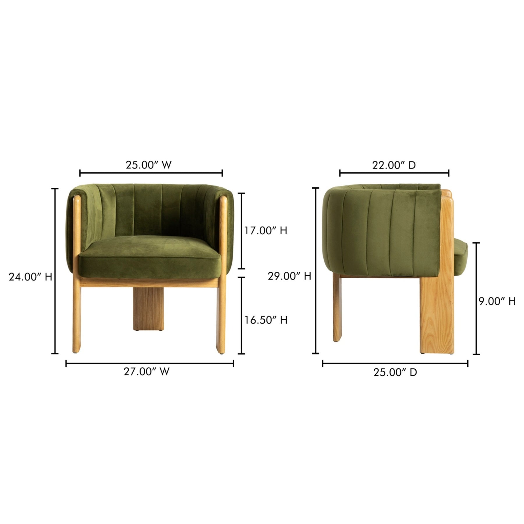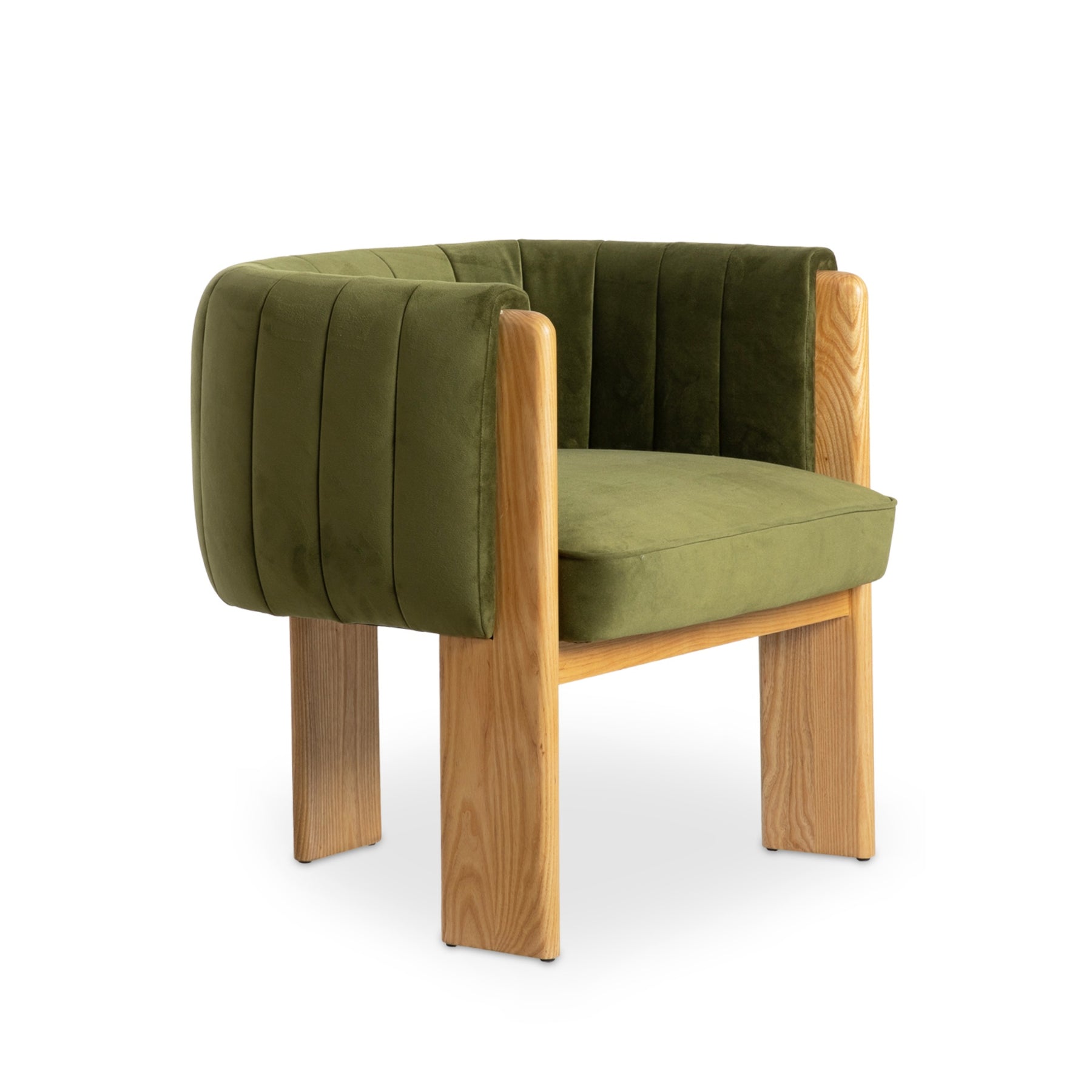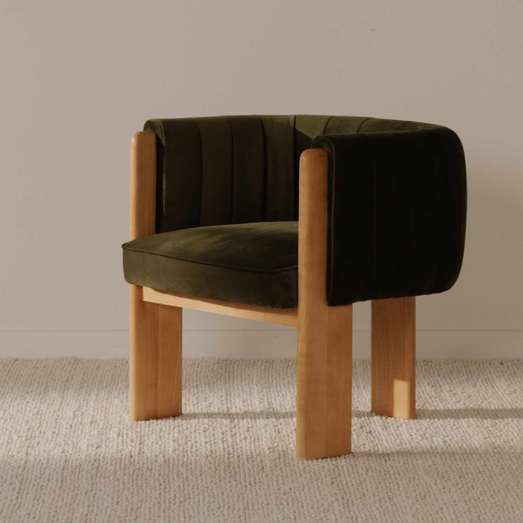 The Sofia accent chair brings contemporary design with vintage allure. An interplay of warm, 70s-inspired tones accentuate a bold sculptural, 3-leg design. Fold-over-like detailing on the arms of the chair expose the lustrous golden ash wood frame, while intricate upholstery channel detailing adds depth and texture to this inviting and nostalgic piece.