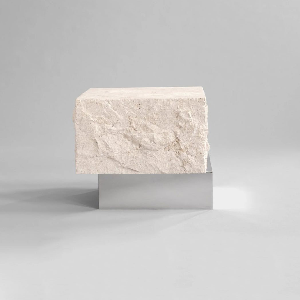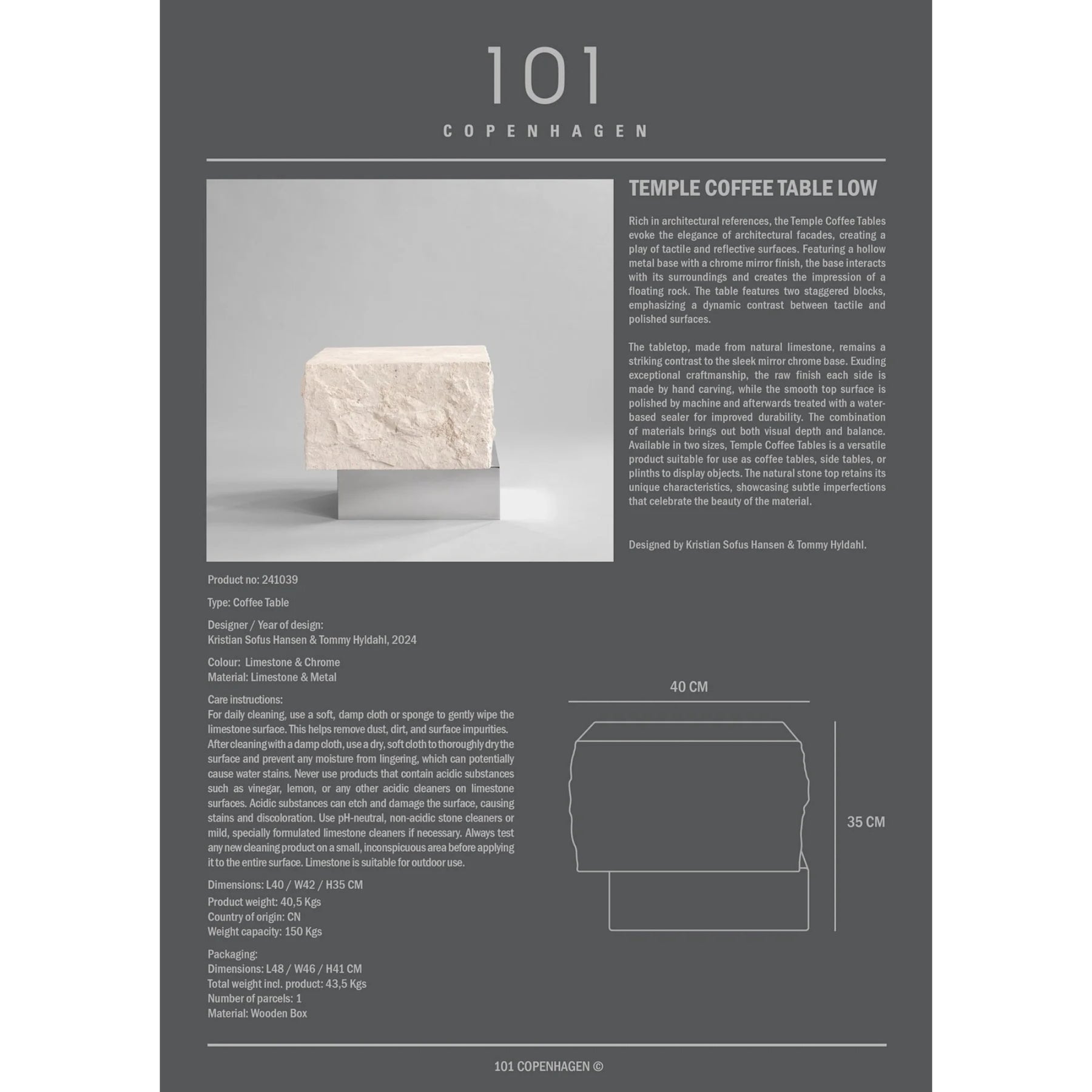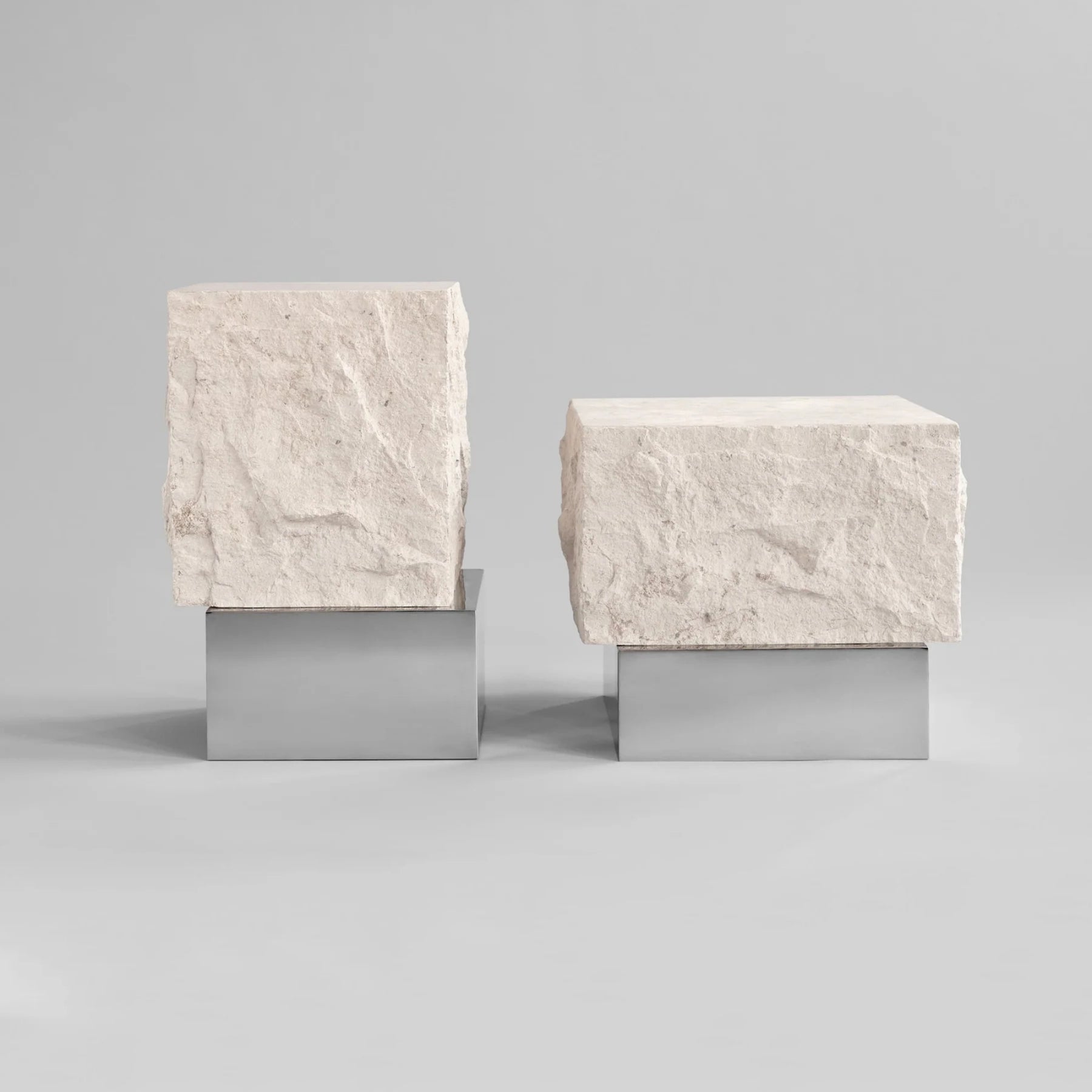 Rich in architectural references, the Temple Coffee Tables evoke the elegance of architectural facades, creating a play of tactile and reflective surfaces. Featuring a hollow metal base with a chrome mirror finish, the base interacts with its surroundings and creates the impression of a floating rock. The table features two staggered blocks, emphasizing a dynamic contrast between tactile and polished surfaces. The tabletop, made from natural limestone, remains a striking contrast to the sleek mirror chrome base.