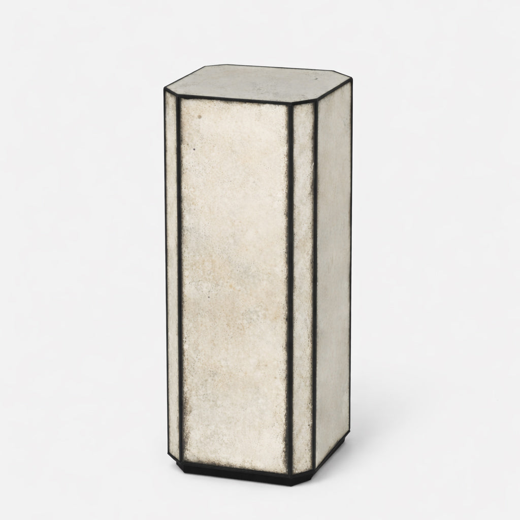 The Wrenley Antique Mirror Pedestal is crafted from a solid wooden frame covered with antique mirror panels with beautifully aged patina. The imperfect spots, speckles, and weathered areas aren't flaws; they're character marks that add vintage charm and authenticity.