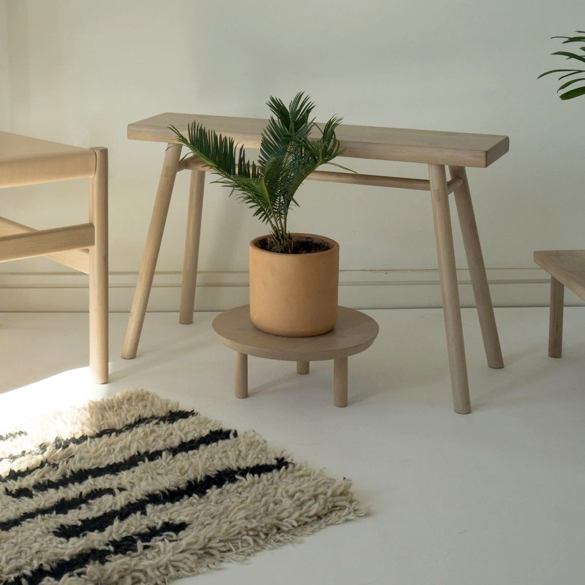 A simple and clean plant stand. This is the rounded version of the Yucca Stand and includes an angled cut along the edge. The house-made tenna oil is hand rubbed. Please note that we make each piece by hand, and every tree is different, so you’ll see slight variations in color and pattern. These aren’t machine made, and we use solid wood, not veneer or engineered wood!